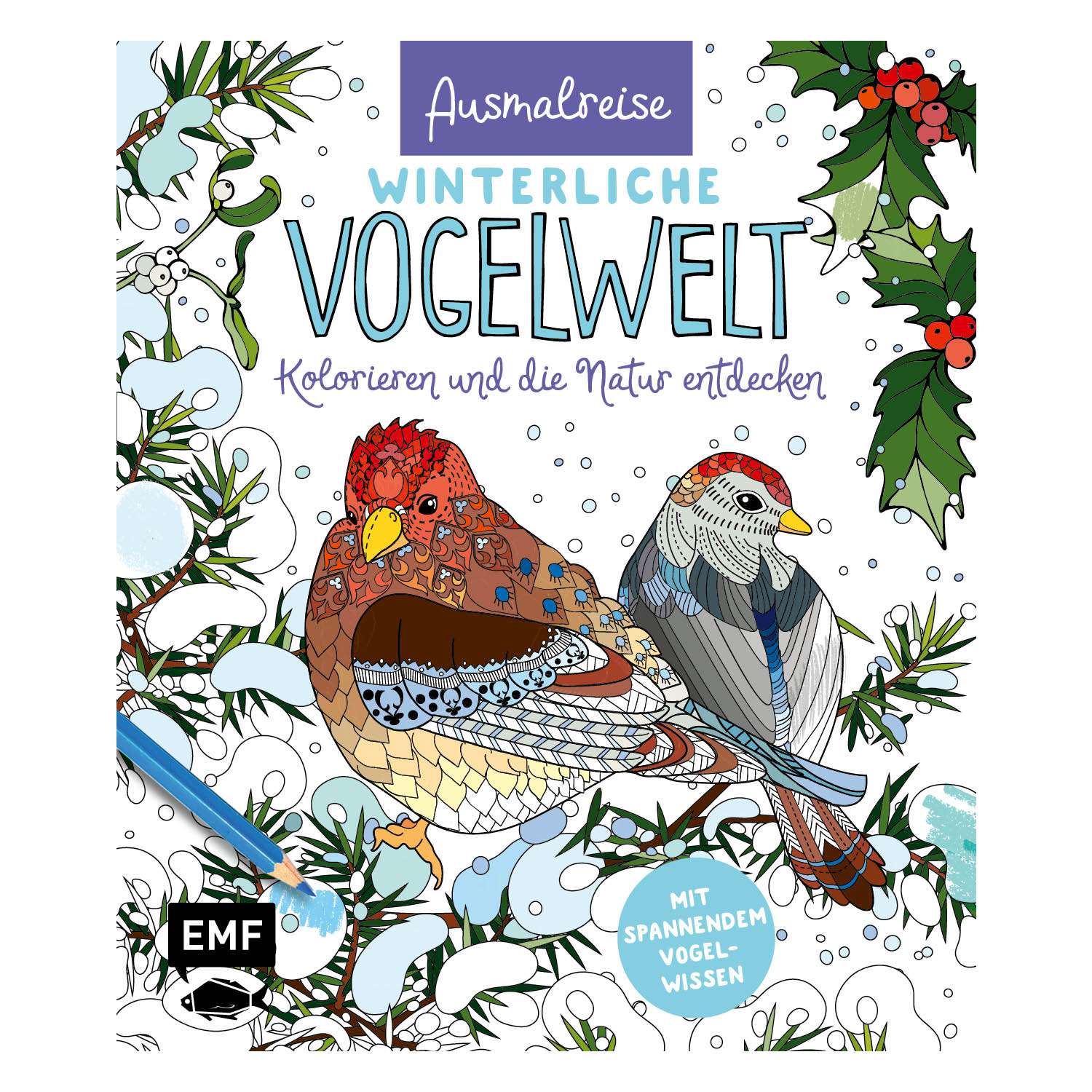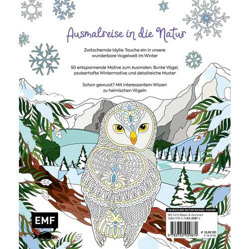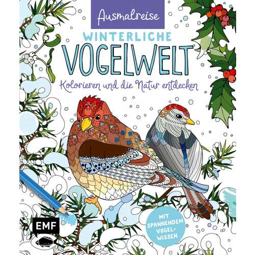 Entdecke die heimische Vogelwelt auf völlig neue Art und Weise! Tauche ein in den bunten Artenreichtum der winterlichen Natur und erlebe entspannende Stunden voller Kreativität und Farbenvielfalt. Mit seinen detaillierten Illustrationen nimmt dich dieses Ausmalbuch mit auf eine Reise durch den Winter. Lass deiner Fantasie freien Lauf, während du die schmuckvollen Federn, idyllischen Eislandschaften und interessanten Vögel mit deinen Lieblingsfarben zum Leben erweckst. Egal, ob du eine kreative Auszeit suchst oder bewusst entspannen möchtest – dieses Ausmalbuch lädt dazu ein, zur Ruhe zu kommen und den Alltag hinter sich zu lassen. Begleitend zu den Motiven vermittelt das Buch interessantes Wissen rund um heimische Vogelarten und verbindet kreatives Kolorieren mit dem Entdecken der Natur.