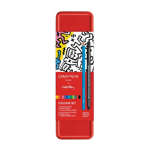 Egal ob Anfänger, Profi oder Künstler: das hochwertige Stifteset von Caran d'Ache + Keith Haring sorgt für kreative Momente. Mit dieser Sonderedition entstand eine generationenübergreifende und symbolträchtige Kollektion, die sich auf die unverkennbaren Muster dieses großartigen Pop-Künstlers beruft, um die Liebe und die Kunst zu feiern. Das Set bestehend aus 10 wasservermalbare Farbstiften und 1 schwarzem Fibralo Brush-Stift mit Pinselspitze, der die typische schwarze Linie von Keith Haring widerspiegelt.