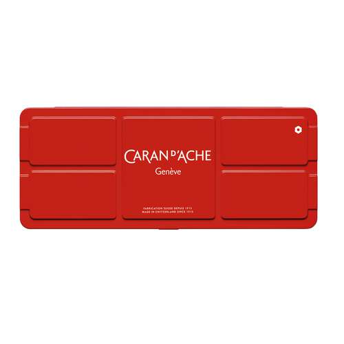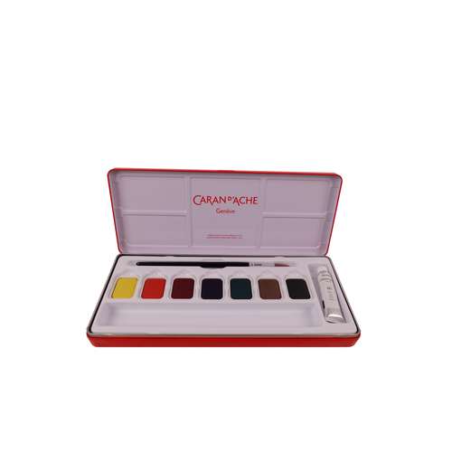 Farbkasten-Set von CARAN D'ACHE mit 7 oder 14 Farbtabletten, plus einer 10 ml Tube Deckweiß und einem Pinsel Größe 5. Gouache ist eine Farbe mit natürlichen Bindemittel und verfügt über eine hohe Pigmentkonzentration. Sie ist matt, gut deckend, bleibt geschmeidig und wird nicht rissig. Nach dem Trocknen wieder wasserlöslich.
