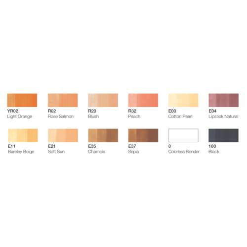 - 00 Black, E00 Cotton Pearl, E04 Lipstick Natural, E11 Bareley Beige, E21 Soft Sun, E35 Chamois, E37 Sepia, R02 Rose Salmon, R20 Blush, R32 Peach, YR02 Light Orange, 0 Colorless Blender