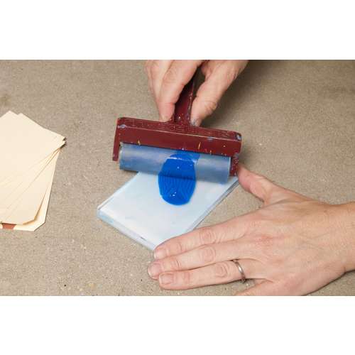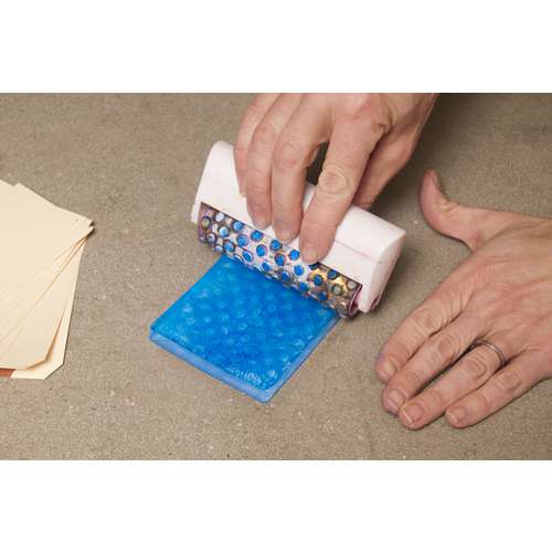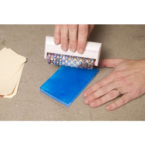 Gelli Arts Gel Druckplatten, rund sind in einer Vielzahl von Größen erhältlich. Zu Beginn des Druckvorganges wird die Acrylfarbe auf die Platte aufgetragen. Hierzu kann beispielsweise ein Pinsel verwendet werden. Idealer zum Auftrag sind jedoch Walzen, beziehungsweise Rollen. Anschließend lassen sich die Druckmuster direkt auf die Platte malen oder mithilfe von Masken und Schablonen aufbringen. Nun kann das Papier bedruckt werden. Beim Experimentieren mit Druckmotiven sind keine Grenzen gesetzt.