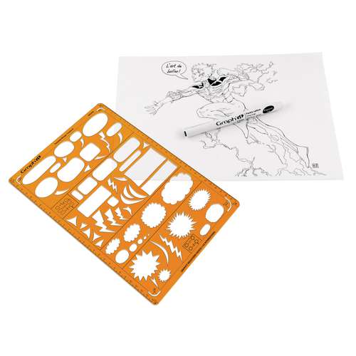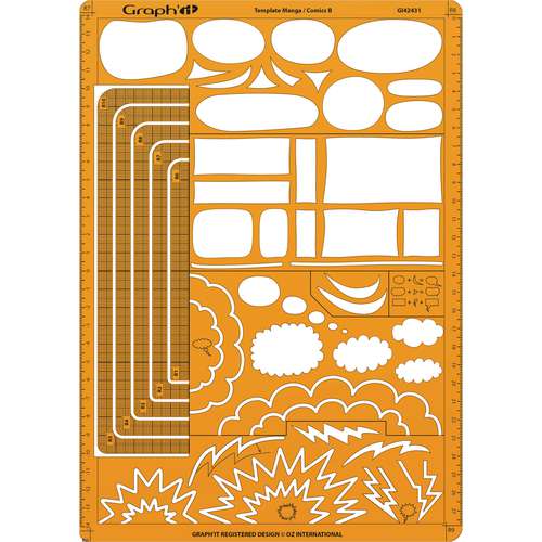 Die Graph'it Zeichenschablone ist optimal geeignet für die Gestaltung von Sprech- und Gedankenblasen in Comics und Mangas. Fahren Sie einfach mit einem Stift die ausgestanzten Öffnungen nach und schon entsteht eine schöne und sauber gezeichnete Sprechblase.