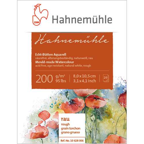 HAHNEMÜHLE 200 Echt-Bütten Aquarell-Block, ein Aquarellkarton, der sowohl für Anfänger als auch Fortgeschrittene geeignet ist. Naturweiß, 200 g/qm, säurefrei, lichtbeständig und von höchster Alterungsbeständigkeit. Alle Blöcke sind rundum mit einem Gazestreifen verleimt, der eine gute Flachlage nach dem Anfeuchten gewährleistet. Das Hahnemühle Echt Bütten Papier wird auf einer klassischen Rundsiebmaschine hergestellt. Verschiedene Naturfilze erzeugen eine einzigartige matte Oberfläche. Erhältlich als Aquarellblock mit 20 Blatt. – Preis pro Block.
