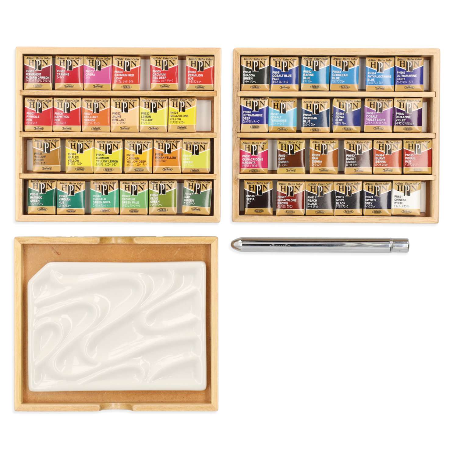 Permanent Alizarin Crimson, Pyrrole Red, Carmine, Naphthol Red, Opera, Brilliant Orange, Cadmium Red Light, Cadmium Red Deep, Vermilion Hue, Jaune Brilliant, Lemon Yellow, Imidazolone Yellow, Yellow Ochre, Naples Yellow, Cadmium Yellow Lemon, Cadmium Yellow Deep, Indian Yellow, Leaf Green, Sap Green, Olive Green, Viridian Hue, Emerald Green Nova, Cadmium Green Pale, Bamboo Green, Shadow Green, Cobalt Blue Pale, Marine Blue, Cerulean Blue, Phthalocyanine Blue, Ultramarine Light, Ultramarine Deep, Cobalt Turquoise, Prussian Blue, Royal Blue, Cobalt Violet Light, Dioxazine Violet, Indian Red, Burnt Umber, Burnt Sienna, Raw Umber, Raw Sienna, Quinacridone Magenta, Sepia, Imidazolone Brown, Peach Black, Ivory Black, Payne's Grey, Chinese White.