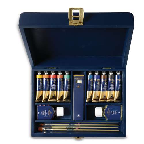 Die MAIMERI Puro Ölfarben Holzbox enthält 17 hochwertige Ölmal-Utensilien. Alle enthaltenen Farbtöne sind hochwertige 1-Pigment-Töne. Stilvoll verpackt in einer eleganten Holzbox.