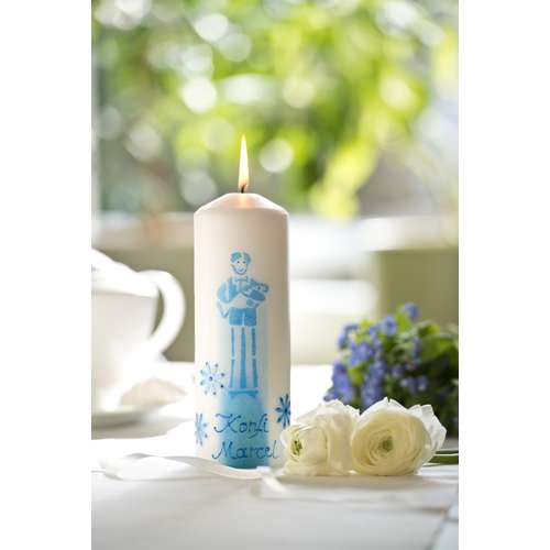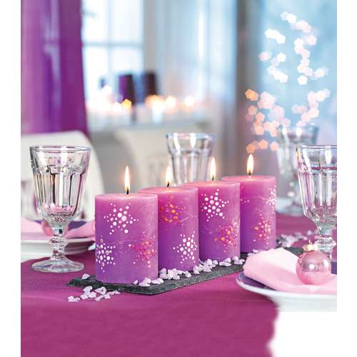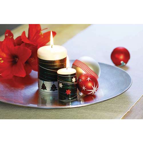 Schablonenmotive - Fixieren Sie eine beliebige Schablone auf der Klarsichtfolie und überziehen Sie diese mit Hilfe eines Spachtels mit der Wachsmalfarbe. Entfernen Sie anschließend die Schablone, lassen Sie das Motiv vollständig trocknen und überziehen Sie es anschließend komplett mit einer zweiten Farbe. Nach 4 - 5 Stunden Trocknungszeit ist die Wachsplatte fertig und kann von der Folie abgezogen werden. Entsprechend der Kerzengröße in Form geschnitten, wird die Wachsplatte nun auf die Kerze geklebt.