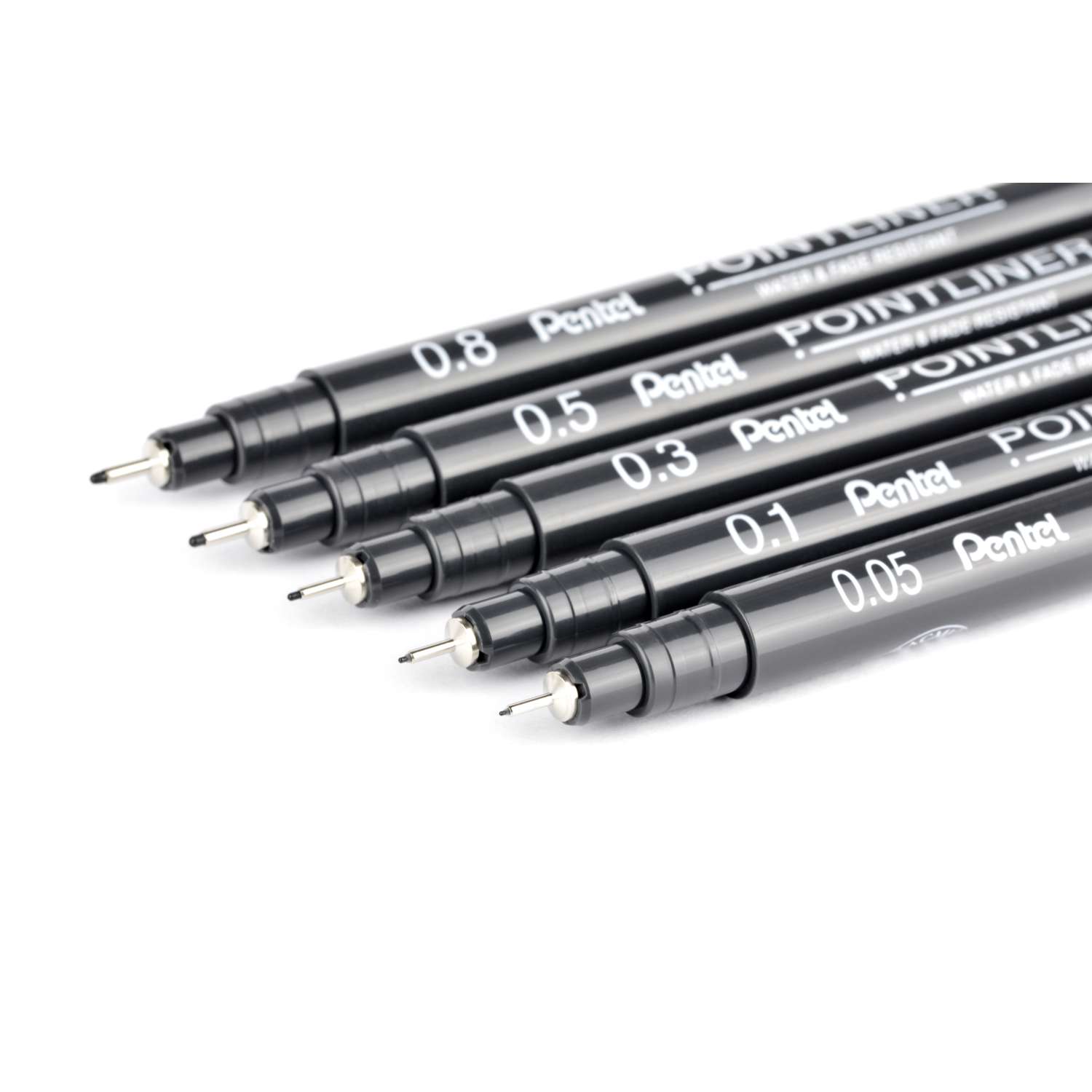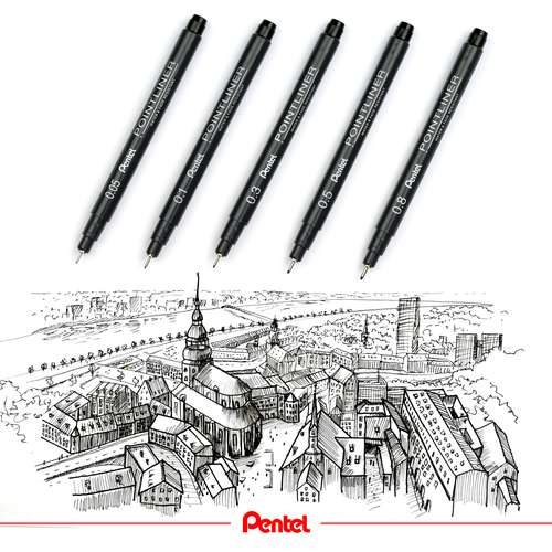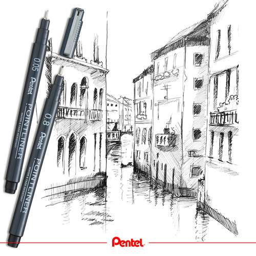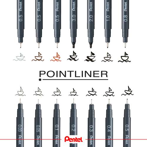 Die Pentel® POINTLINER sind in verschiedenen Strichstärken mit schwarzer Tinte erhältlich. Zusätzlich gibt es die 0,5 mm Variante auch in Grau, Sanguine und Sepia – ideal für abwechslungsreiche Zeichnungen und Skizzen.