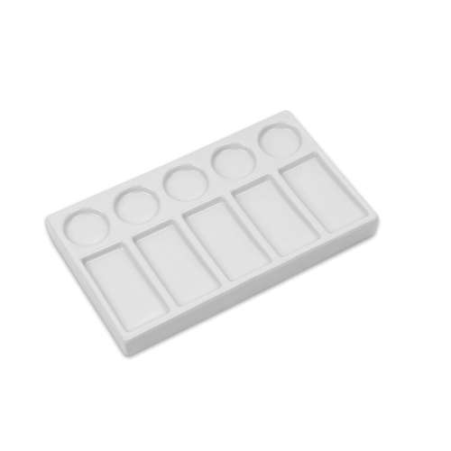 Verschiedenförmige Porzellanpaletten aus Hartporzellan mit lösungsmittelbeständiger Oberfläche. Die Porzellanpaletten eigenen sich zum Anmischen wasserlöslicher Farben und haben sich auch bei der Arbeit mit anderen Farben als praktisches, nützliches Utensil erwiesen.