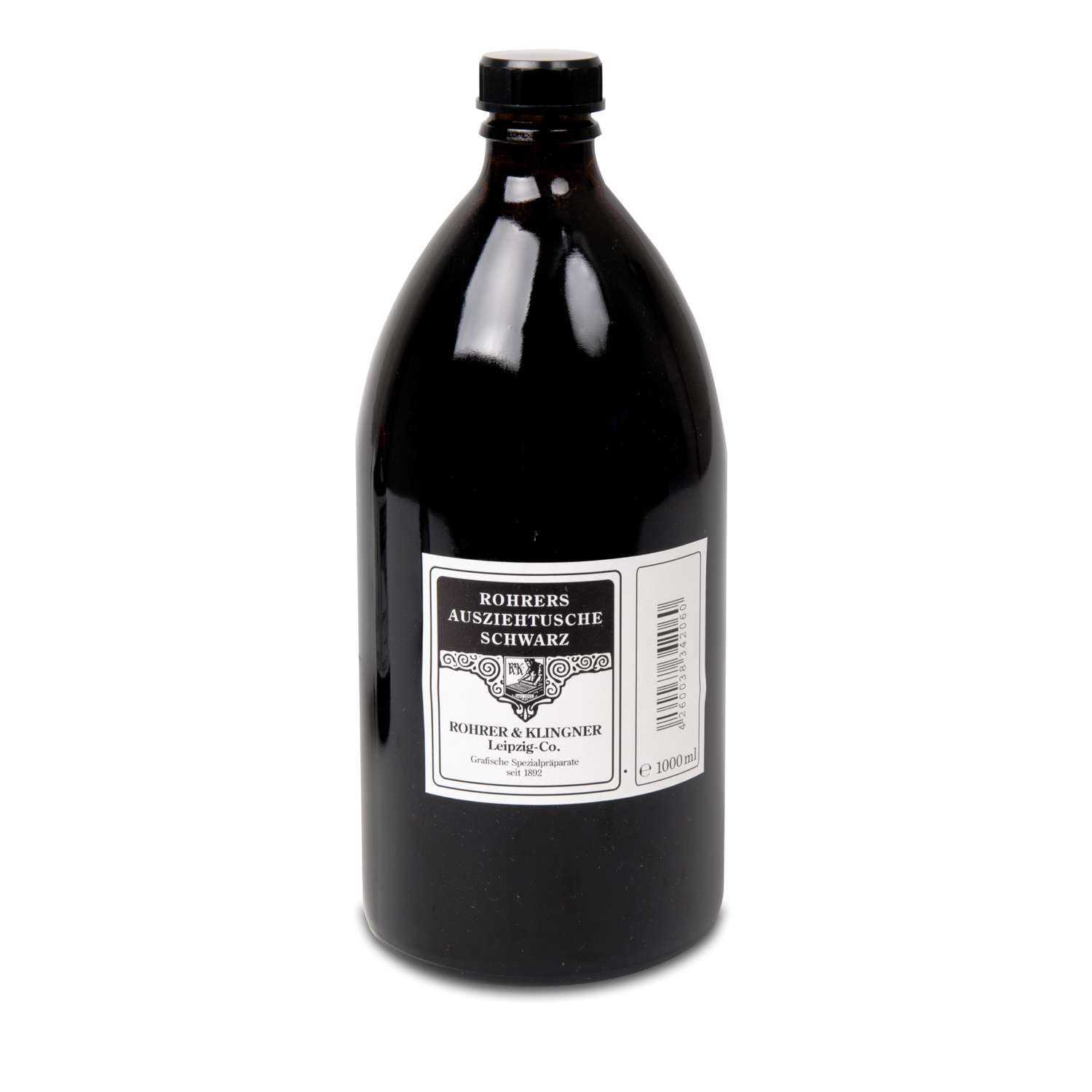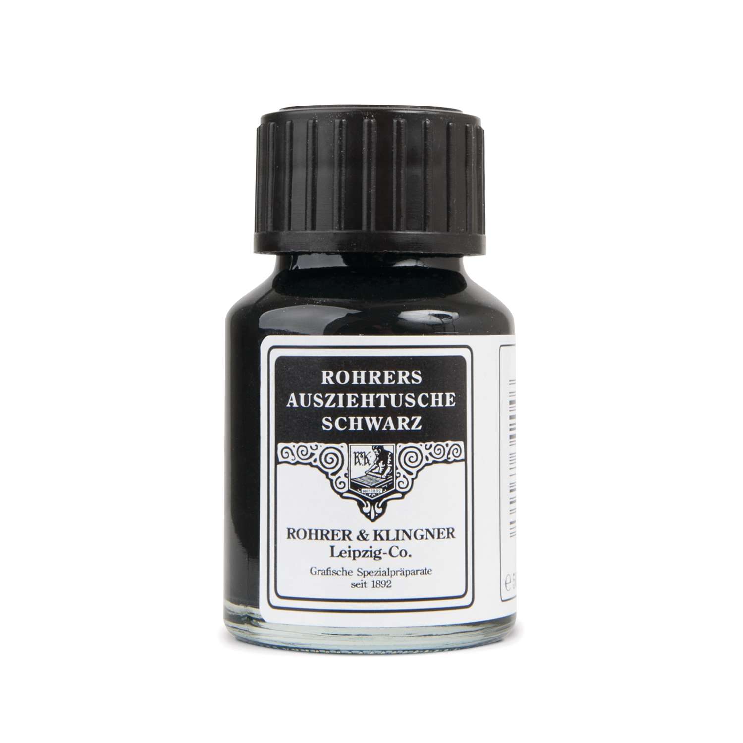 ROHRER & KLINGNER Ausziehtusche Schwarz, ist universell in ihrem Anwendungsbereich und eignet sich sowohl für feine kalligrafische Arbeiten und Federzeichnungen als auch für Absprengtechnik und malerische Pinselzeichnungen. Sie ist unverdünnt deckend tiefschwarz, lässt sich aber auch mit destilliertem Wasser zu Grautönen verdünnen. Die Ausziehtusche