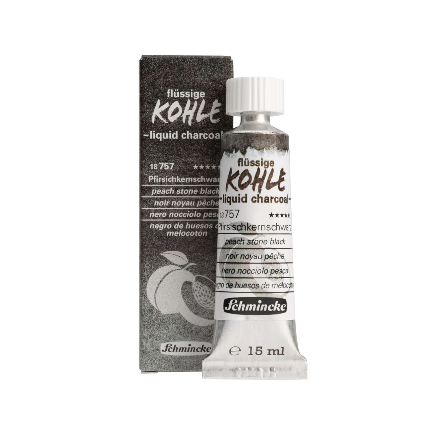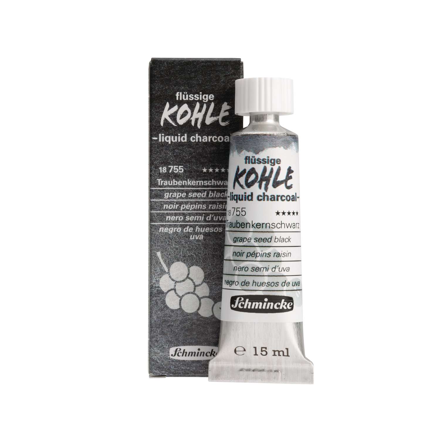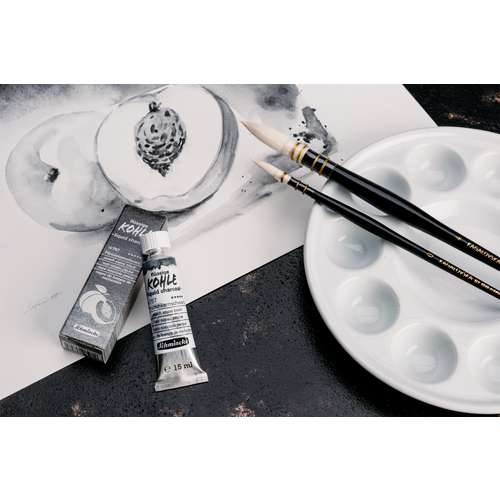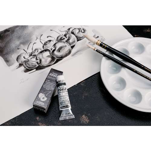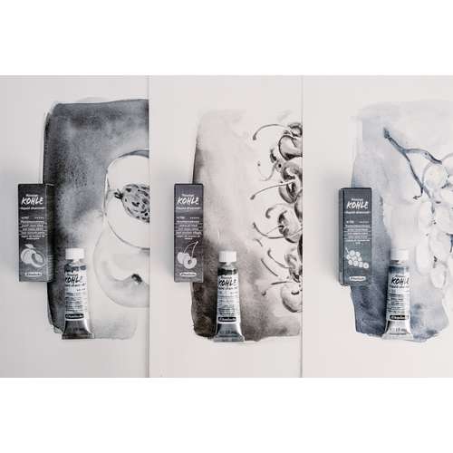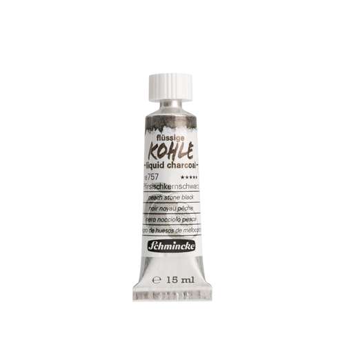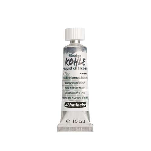 Flüssige Kohle in drei Schwarznuancen schafft den Sprung von der Zeichnung zur Malerei: Die neue flüssige Kohle im Schmincke-Sortiment ermöglicht eine saubere, da staubfreie Art der Malerei, Kohlezeichnung und Untermalung mit Kohle. Schmincke bietet gleich 3 Farbnuancen an: Die 3 hierzu verwendeten Pigmente natürlichen Ursprungs (PBk 8, Kernschwarz) entstehen durch die Verkohlung von Obstkernen aus dem EU-Gebiet und ergeben die folgenden einzigartigen Kohle-Nuancen: