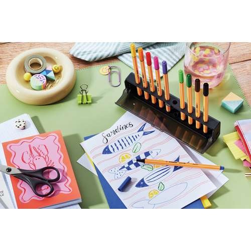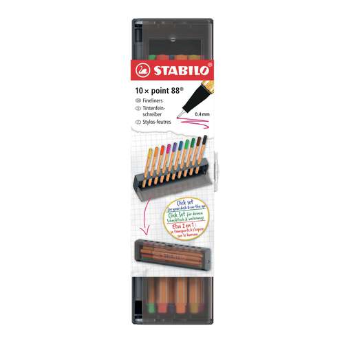 Das STABILO® Point 88 Click Set vereint Präzision, Funktionalität und ikonisches Design in einem praktischen Format für unterwegs und den Schreibtisch. Es enthält 10 Fineliner mit feiner 0,4 mm Spitze, die sich ideal für exakte Linien, Zeichnungen und Arbeiten mit Lineal oder Schablone eignen.