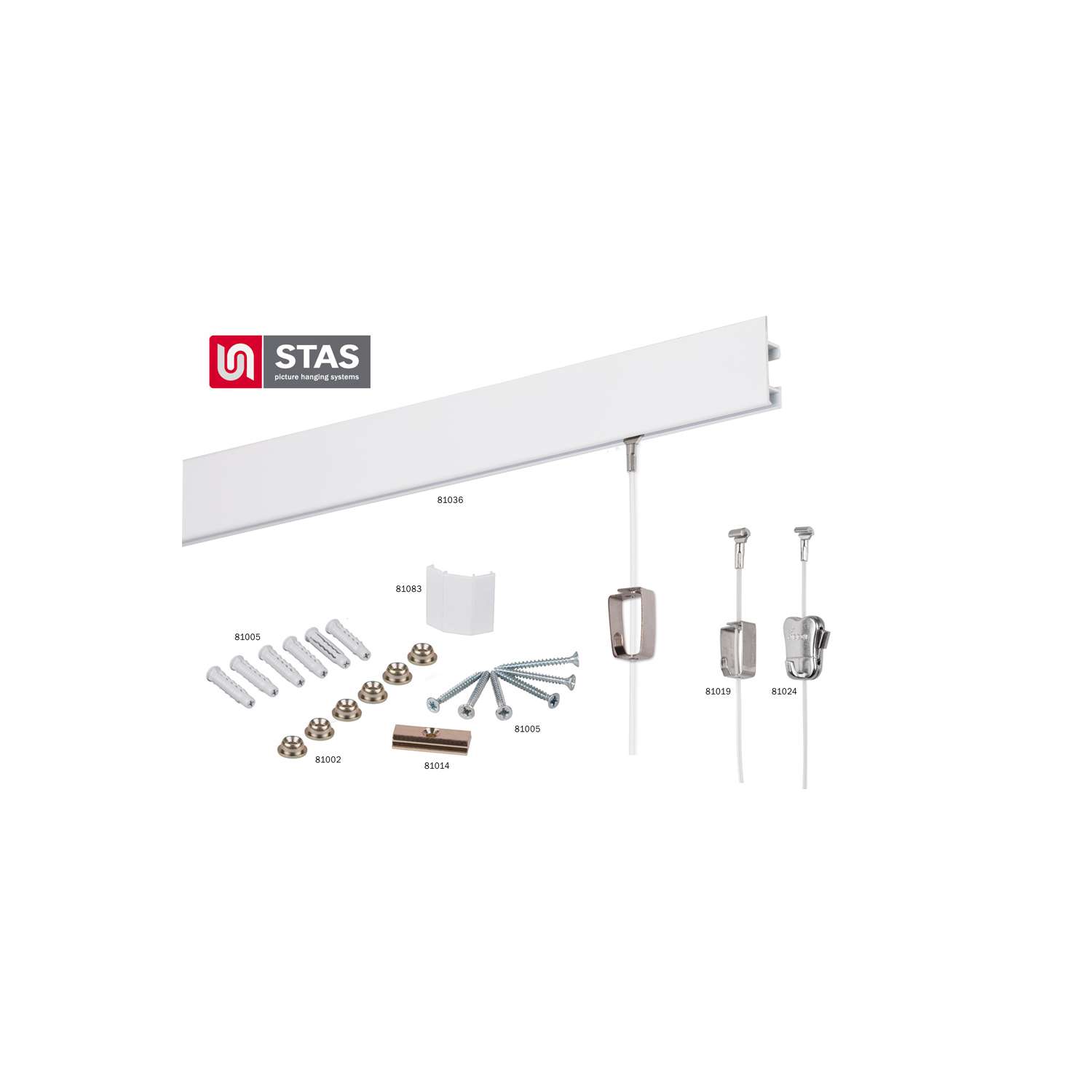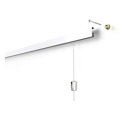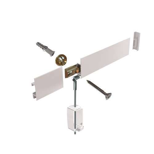 Das STAS cliprail Komplett-Set ist ein robustes, schnörkelloses Aufhängesystem. Die STAS cliprail wird mit einem speziellen Montageclip an der Wand befestigt. Die in den Farben Weiß oder Aluminium erhältliche Schiene ist einfach anzubringen und passt in jeden Raum, denn die Bilderschiene schließt sich nahtlos an Flachdecken an. Gleichzeitig lässt sich die überstehende Blende zum Verbergen von z.B. Lautersprecherkabeln benutzen. Die STAS cliprail Bilderschiene ist die am meisten verwendete Aufhängeschiene. und hat eine max.Tragkraft von 20 kg/m.