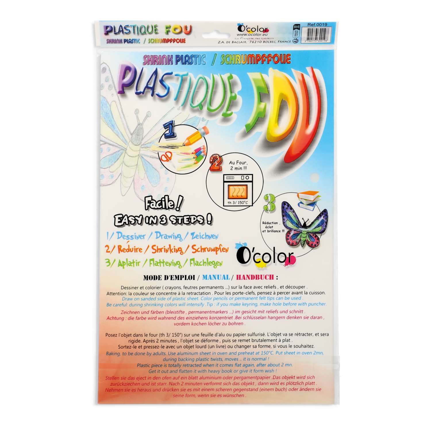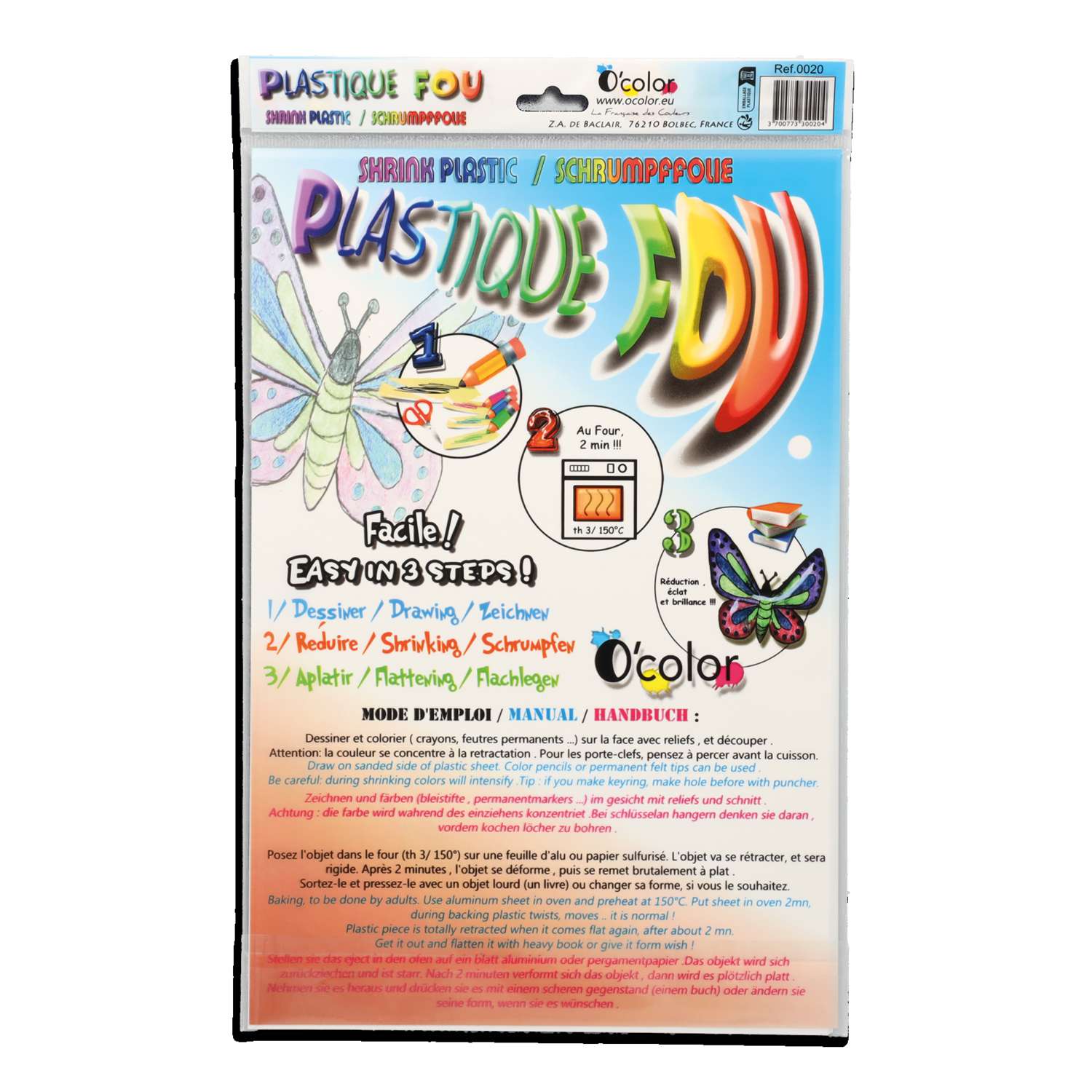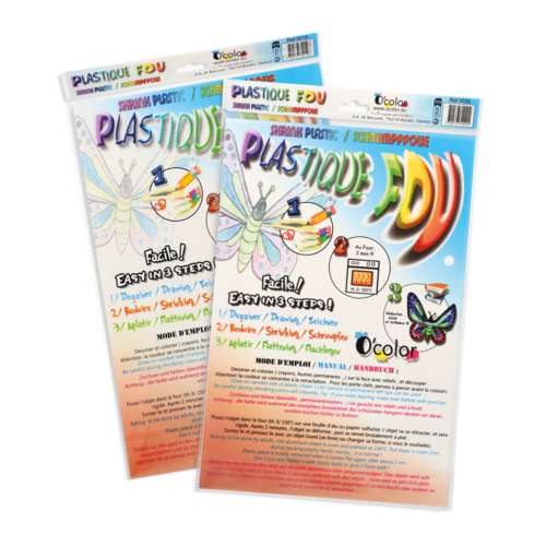Schrumpffolie ist ein Werkmaterial und eignet sich zum Gestalten von Handy-, Schmuck-, Schlüssel-, Geschenkanhängern, Magneten und vielem mehr. Die Folie schrumpft im Backofen bei 150 °C um ca. 3/4 ihrer Ursprungsgröße. Die Schrumpffolie ist einseitig geschliffen bzw. angeraut. Durch die raue Oberfläche lässt sich die Schrumpffolie mit Farbstiften (z. B. Faber Castell Polychromos) und permanenten Faserstiften oder Markern bemalen. Durch das Schrumpfen wird die Farbe intensiver und leuchtender. Die Folie wird zudem dicker und fester. Lieferbar sind Packungen mit je 7 Bögen in den Farben Transparent, Weiß und Schwarz. – Preise pro Packung.