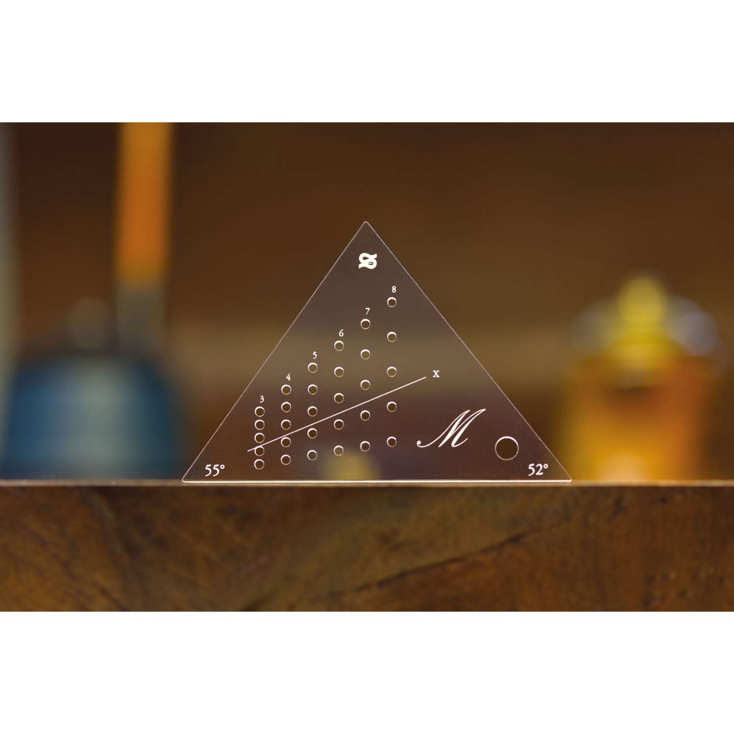 Mit seinen abgestuften Markierungslöchern ermöglicht das Masgrimes Lining Triangle x-Höhen zwischen 3 mm und 8 mm. Zusätzlich sind feste Winkel für verschiedene Kalligrafiestile integriert: 55° für Roundhand sowie 52° für Spencerian. Durch das innovative 5-Loch-System, bei dem die Kante des Werkzeugs als sechste Linie fungiert, lassen sich individuelle und komplexe Liniensysteme mühelos erstellen.