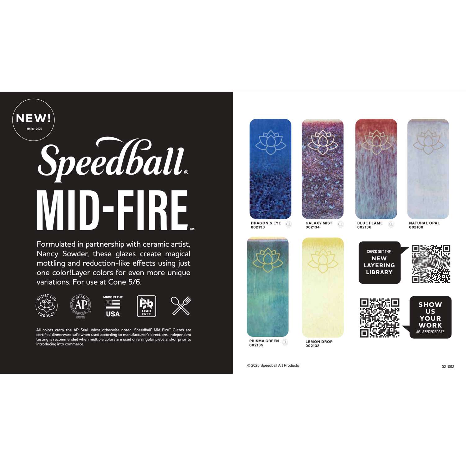 Die Glasuren können einzeln verwendet oder übereinander geschichtet werden, um zusätzliche Farbtiefe, Variationen und optische Effekte zu erzielen. Alle Mid-Fire Glasuren sind bleifrei, AP-zertifiziert und bei richtiger Anwendung dinnerware safe.
