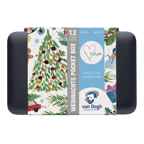 Für alle Watercolour-Projekte in der Weihnachtszeit: Die van Gogh Stifteliebe Pocket Box Weihnachts-Edition enthält 12 halbe Näpfchen van Gogh Aquarellfarbe. Die Farbauswahl dieser beliebten und limitierten Pocket Box ist besonders für die Weihnachtszeit geeignet. Die herausnehmbare Palette im Deckel bietet viel Platz zum Mischen, der großzügige Raum zwischen den Näpfchen erleichtert das Entnehmen und Nachfüllen. Darüber hinaus enthält die van Gogh Pocket Box einen zusammensteckbaren Van Gogh Aquarell-Pinsel der Größe 06. Alle Teile sind herausnehmbar und leicht zu reinigen. Über den QR-Code in der Box ist ein digitaler Guide mit Vorlagen und Inspirationen abrufbar. Für Anfänger und Künstler gleichermaßen gut geeignet.