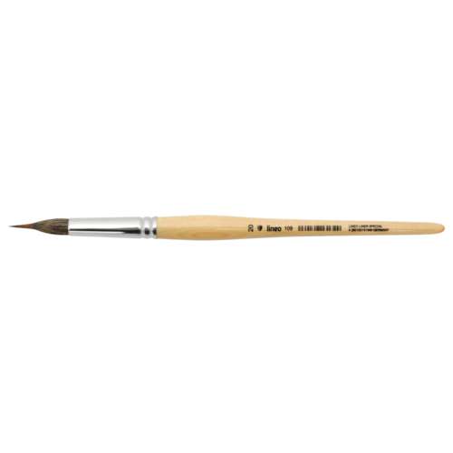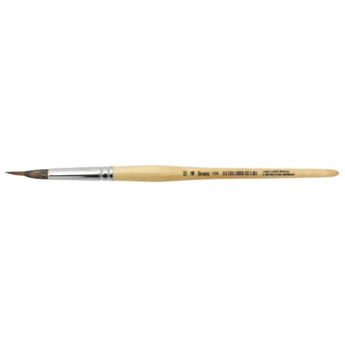 In Deutschland handgefertigter Echthaar Aquarellpinsel. Der Pinselkopf dieser professionellen Aquarellpinsel-Serie 109 der Marke lineo besteht aus zwei Teilen. Der Kern des Pinsels, der auch die extralange, nadelfeine und spitze Rundspitze bildet besteht aus allerfeinstem Kolinsky Rotmarderhaaren, der Mantel des Pinsels aus reinen Fehhaaren. Der bauchige Teil des Pinsels nimmt viel Farbe auf und dient als Reservoir, für eine längere konstante Farbabgabe.