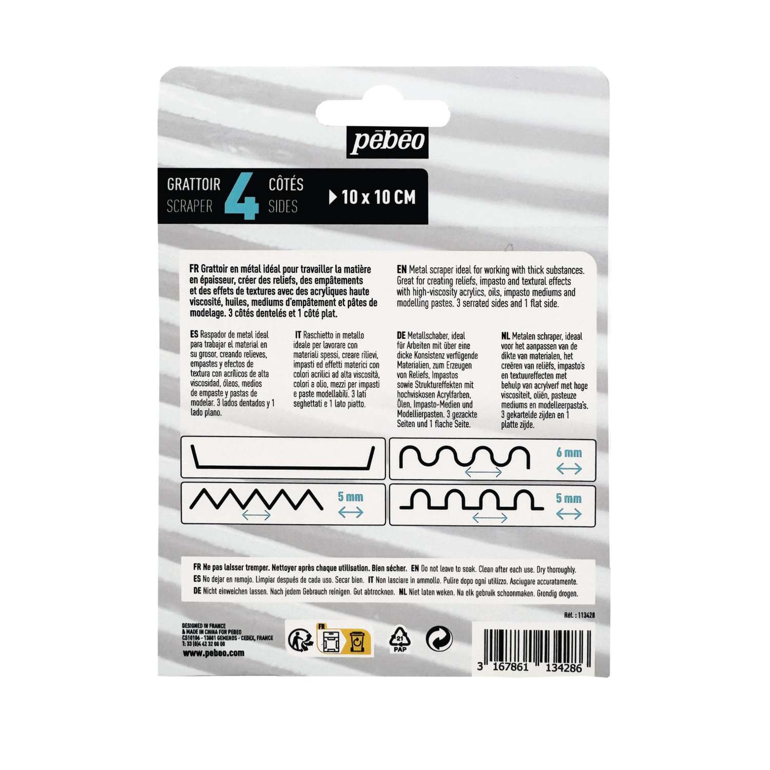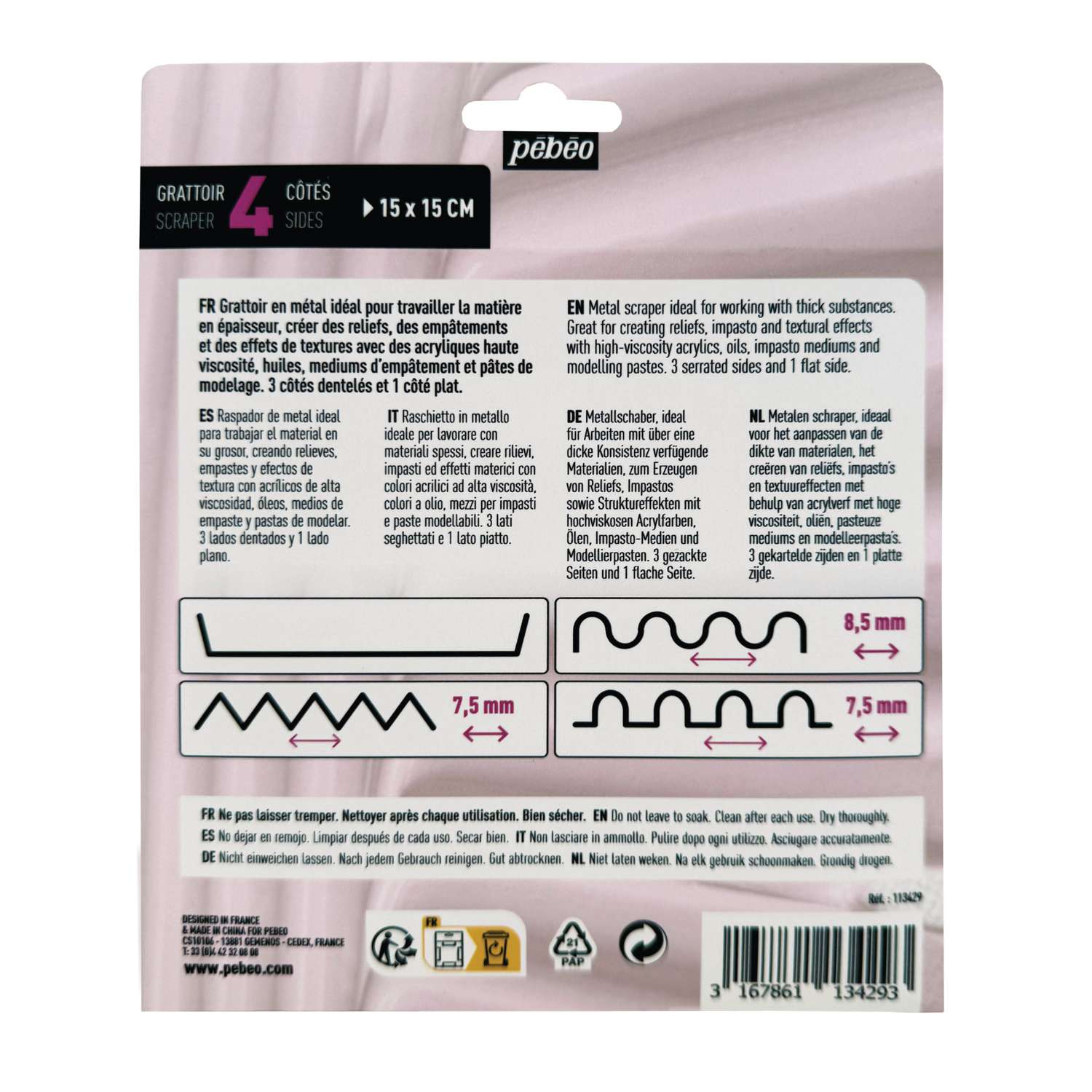 Jeder Spachtel verfügt über drei gezahnte Seiten in unterschiedlichen Formen sowie eine glatte Seite. Diese Kombination bietet eine Vielzahl von Gestaltungsmöglichkeiten und eignet sich besonders für ausdrucksstarke Arbeiten mit pastosen Farbaufträgen.